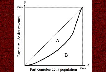 On lui doit le coefficient de Gini, une mesure de l'inégalité de revenu dans une société donnée. Sur le diagramme de la courbe de Lorenz (voir image ci-contre), qui donne la richesse cumulée en fonction de la population, si l'aire de la zone entre la diagonale d'égalité parfaite (en pointillés) et la courbe de Lorentz (en gras) est A, et l'aire de la zone à l'extérieur de la courbe de Lorenz est B, alors le coefficient de Gini est A/(A+B).