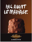 Comme chocoladdict, je suis tombée en arrêt devant cette affiche de la campagne de pub Rocher Suchard ... Le thème est original et fait réagir avec différents slogans comme "Vous êtes plutôt cuir ou plutôt chocolat?", ou encore "Dieu merci on peut encore montrer un rocher nu", et enfin "Pas avant le mariage" .... Manger un Rocher c'est du sérieux !