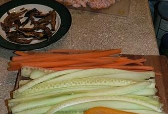 Mouiller deux-trois centimetres du haut de la feuille de Nori. Utilisez ensuite vos doigts pour rouler délicatement la feuille sur elle-meme. C'est la que je vos dis qu'Hubby il du sang Japonais. Il n'aime pas utiliser les rouleaux de bambou il trouve que c'est plus simple de faire ca a la main.Wet about an inch of the top of the Nori sheet. Then use your fingers to delicately roll the sheet on itself. That's where I tell you that Hubby has Japanese blood because he doesn't lie to use the bamboo mats, he finds it easier to do it all by hand.