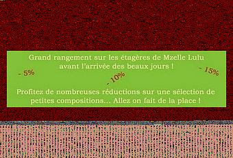 Le soleil et la douceur sont annoncés pour les jours prochains et quoi qu'il arrive, le printemps sera là dimanche 21 mars !Alors, en attendant son arrivée et pour faire de la place sur les étagères de l'atelier, profitez des réductions valables seulement du 14 au 20 mars. Pourquoi ne pas en profiter pour faire vos petits cadeaux en avance, non ?A tout de suite !