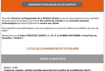 Quoi : un emailing du Salon de la Stratégie client, reçu le 11 mars, dont l'objet est : "J-5 : La 14eme edition du SeCA au sein de Strategie Clients"
