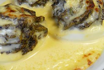 Œufs cuits «durs». Les blancs sont garnis d’une farce à base de jaunes durs hachés, de Duxelles de champignons, de persil et d’un peu de sauce Béchamel. Ils sont nappés de sauce Mornay et gratinés. C’est bon mais c’est très loin d’être léger. Une entrée qui plait aux grands parents.