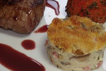 Préparer le clafoutis, mélanger tous les ingrédients dans un saladier, déposer dans une petite plaque que vous avez couvert avec une feuille de papier sulfurisé, faite cuire 25mn à 180°c, retirer du four et réserver au chaud. Préparer la sauce, faite réduire le vin avec l'échalote au 3/4, retirer du feu et monter avec le beurre, saler poivrer et réservé au chaud sans refaire bouillir. Faite grillé vos pavés saler poivrer et servez accompagné de sauce et de clafoutis, bon appétit.ps : j'ai ajouté des tomates rôti persillé pour la couleur