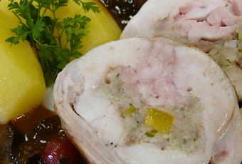 Partie dorsale du lapereau garnie de farce de gorge, de poitrine de porc et de la chair des cuisses du lapereau et cuite à couvert sur une garniture aromatique. Le fond de poêlage est réalisé à partir de fond brun de lapereau légèrement lié et garni de pruneaux et de groseilles. Servi avec des pommes de terre fondantes.