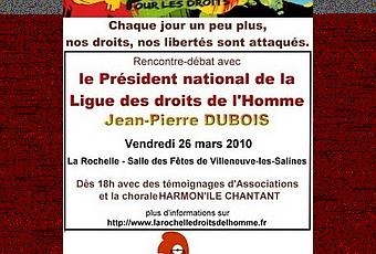 Jean-Pierre DUBOIS, Président national de la Ligue des Droits de l’Homme sera à La Rochelle, le Vendredi 26 Mars, dans le cadre d’une soirée témoignages et débat.