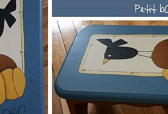 Voici un petit banc que j'ai retrouvé dans mon sous-sol, bien caché! Je l'avais peint suite à des cours de peinture décorative. Je me souviens que j'avais mélangé deux patrons. La fleur n'allait pas avec l'oiseau! Les enfants l'ont maintenant adopté, il est de parfaite hauteur pour accomplir leurs travaux sur le comptoir de la cuisine.Tiens, cette trouvaille me donne le goût de ressortir mes pots de peinture et mes pinceaux!