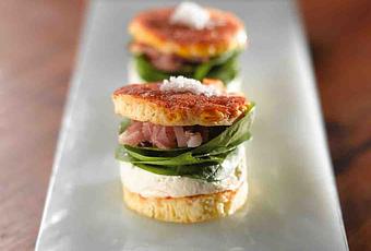 Sur un rond de crêpe, déposer un rond de crème de Reblochon. Ajouter quelques feuilles de salade, une cuillère de jambon en lanières et terminer par un rond de crêpe.