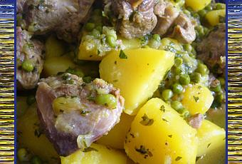 Dans un cocotte, faites chauffez l’huile, mettez la viande et faites la dorer sur toute les faces. Ajoutez ensuite les oignons, l’ail, les épices, un peu de sel et de poivre et faites revenir 2 à 3 minutes. Couvrez ensuite d’eau (1l devrait suffire). Amenez à ébullition à feu moyen, puis couvrez et laissez cuire 50 minutes. Remuez régulièrement. Au bout de 30 minutes, ôtez les cuisses de poulet et réservez les. 15 à 20 minutes avant la fin de cuisson, ajoutez les herbes, les pommes de terre et les petits pois. Laissez cuire à couvert en remuant de temps en temps. Vérifiez la cuisson des pommes de terr. 5 minutes avant la fin, mettez les cuisses de poulet afin de les réchauffer. Goutez, rectifiez l’assaisonnement. Si la sauce est trop liquide, augmentez le feu et faites bouillir à découvert le temps que la sauce épaississe. Dressez la viande dans un plat de service préalablement chauffé, entourez la avec les légumes, et nappez de sauce. Servez très chaud.