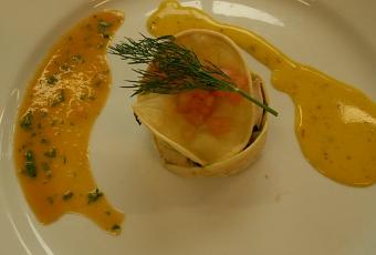 assiettes avec les deux sauces et placer la lasagne ; garnir avec de l’aneth,