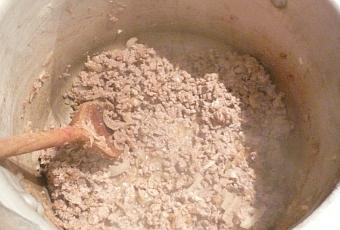 Faire revenir les oignons et l’ail (écrasé) dans le beurre. Ajoutez la viande.