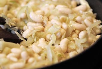 Rincez délicatement les haricots dans une passoire à l'eau fraîche. Pelez et émincez l'oignon en fines lamelles. Nettoyez les fenouils et émincez-les comme les oignons. Faites chauffez un peu d'huile dans une poêle et faites-y revenir l'oignon et les fenouils, avec du sel et du poivre, jusqu'à ce qu'ils soient bien tendres. Ajoutez les haricots, mélangez et laissez mijoter cinq minutes à feu moyen. Rectifier l'assaisonnement si nécessaire.