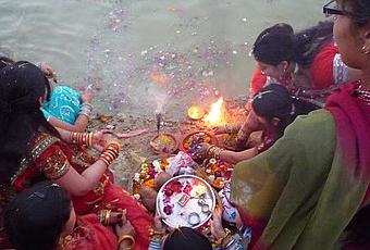 Les jeunes filles portent des statues représentant Isar et Gauri (Shiva et Parvati) et vont les mettre dans le lac avec les offrandes.