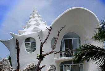 Au rayon des maisons atypiques, voici la perle du mois : la Conch Shell House, située sur la pointe sud de Isla Mujeres, une île distante de 20 minutes en bateau de Cancun dans la mer des Caraïbes, au Mexique. Cette maison, qui offre un splendide panorama à 180 degrés sur le mer des Caraïbes, est construite sur le modèle d’un célèbre coquillage : la conque de Lambi. On ne fait pas mieux comme architecture organique ! La structure de la construction est somme toute classique, puisque la maison est construite en béton, avec l’ajout de matériaux trouvés et recyclés. Le propriétaire des lieux, Octavio Ocampo, qui est un artiste bien connu, a réalisé lui même les plans de la maison. L’intérieur de la maison décline également le thème du coquillage. La salle principale, tout en rondeurs, n’a pas de coins. L’évier de la salle de bains à l’étage est faite de la base d’une conque, les robinets sont fabriqués à partir de corail, les porte-serviettes sont faits à partir de conques, de coquillages et d’autres objets trouvés sur la plage locale.