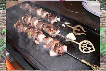 Détailler un gros oignon en morceaux larges pouvant être piqués sur la brochette. Enfiler les cubes de viande en alternant lard, viande, oignons, lard.....Préchauffer longuement une plancha ou un grill extérieur, cuire selon le degré de cuisson souhaité de façon équivalente sur les quatre faces.