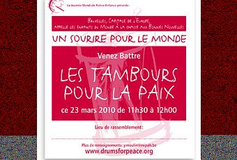 Le 23 mars, entre 11h et 12h, à l'initiative de l'association “Tambours pour la paix” ( http://www.drumsforpeace.org/fr/index.htm ), 86 110 Tambours dans 90 lieux seront battus par les enfants. Cette année, le thème choisi est: “Un sourire pour le monde”.