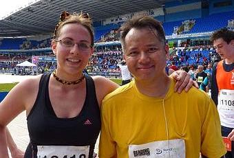 Le lendemain, par un savant dosage de bus, métro, train et navette, nous arrivons au Stade Madejski sous un superbe soleil de printemps, en décalage complet avec la pluie bretonne que nous avions essuyée la veille. Fanny est une grande sportive depuis l'âge de cinq ans et en ce moment c'est plutôt le vélo avec ses séances de spinning ou vélo en salle avec un prof qui donne des consignes pour des exercices d'endurance ou d'accélérations en côtes avec de la musique. Pour toute préparation à son premier semi, elle a eu un entraînement léger, très léger puisqu'il s'agissait de courir deux fois 7 km.