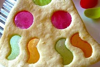 12. Remplir les parties évidées avec la poudre de bonbon. Repasser les biscuits 5 minutes au four. Laisser refroidir avant de les décoller du papier de cuisson. Conserver en boite en fer.