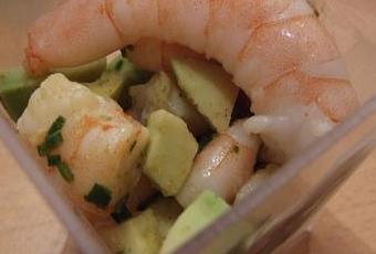 Couper l'avocat en petits cubes. Décortiquer les crevettes et les couper en 3 ou 4 morceaux et les mélanger à l'avocat. Garder quelques crevettes entières pour la déco.