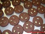 Une fois la ganache épaissi, avec un douille, garnir les fonds qu'on aura retourné au préalable, puis mettre le sablé avec le visage dessus, appuyer pour remplir les yeux et la bouche.