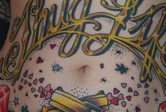 Un beau tatouage ventral bien bling bling, avec "Une vie de malfrat" inscrit en gros, des bagouzes et des poings américains, et des pistolets qui tirent des petits coeurs!