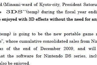 Ainsi il faudra désormais parler de Nintendo 3DS (nom provisoire) dont les promesses sont assez intéressantes... En effet selon le communiqué, la machine (de nouvelle génération ≠ DS actuelles), permettra d'offrir aux joueurs la possibilité de jouer aux jeux qu'elle proposera en 3D et sans lunette s'il vous plaît, oui vous avez bien lu, en 3D comme au cinéma ou sur certains téléviseurs récents mais ici il n'y aura pas besoin de lunette (d'où le nom 3DS).