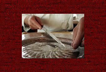L'action de découper recèle la quintessence de l'art culinaire japonais et il est au-moins un domaine où ces gestes anodins à première vue exigent fine lame et dextérité au millimètre près : la découpe du fugu.Ce poisson mortel interdit à la consommation jusqu'au début du XXème siècle en raison des risques sanitaires - et que l'empereur n'a pas le droit de consommer -, est responsable en moyenne de 3 décès par an sur une quarantaine d'intoxications graves parce que le cuisinier a commis une étourderie dans la découpe du poisson. Il fut longtemps consommé en cachette (les samouraïs qui enfreignaient l'interdit pouvaient se voir confisquer leurs terres) mais célébré par les poètes comme Basso ou Issa. Depuis 1949 il faut un diplôme d'état pour le cuisiner, c'est le plus difficile de tous les diplômes culinaires au Japon. Ces dernières années les autorités ont régulièrement légiféré sur les espèces autorisées ou pas. En 2004 un laboratoire japonais a réussi a élever du fugu sans tétrodoxine, ce poison redoutable que l'on trouve dans le foie, le rein et les intestins du poisson qui provoque la mort dans la journée (l'ingestion de cette neurotoxine paralyse systèmes nerveux et respiratoires, il n'y a aucun antidote) mais il n'y eut pas de répercussion commerciale car le danger potentiel fait partie de l'attrait de ce met. La découpe d'un sashimi de fugu se fait en plusieurs étapes :1. avec un couteau Deba on sépare le bec puis on enlève la peau (étape difficile, la chair étant très molle) 2. puis on ote les parties dangereuses (abats, yeux, branchies...) et lève les filets, un de chaque côté de l'arête centrale 3. avec un Sashimi on découpe des tranches très fines et translucides afin qu'on puisse apercevoir les motifs de l'assiette, chaque tranche est "transportée" de la planche à l'assiette sur la fine pointe du couteau même. Avec les doigts et la pointe du Sashimi le cuisinier replie les tranches pour réaliser des pétales (imaginez un chrysanthème éclos).