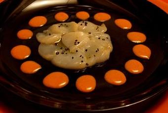 J'ai essayé au départ de faire un cercle de crème de corail autour des saint-jacques : l'horreur ! Ca ne ressemblait à rien. Puis je me suis aperçu que si j'en versais une petite quantité, elle formait une goutte stable. Je me suis donc résolu à faire une série de gouttes tout le tour de l'assiette, avec le mérite d'être original ;o)