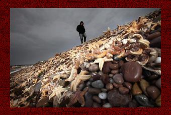 La scène se passe en Angleterre à Budleigh Salterton, des milliers d’étoiles de mer ont été rejetées sur la plage. Les scientifiques attribuent le phénomène au mauvaises conditions météorologiques doublé de d’une marée de forte amplitude.