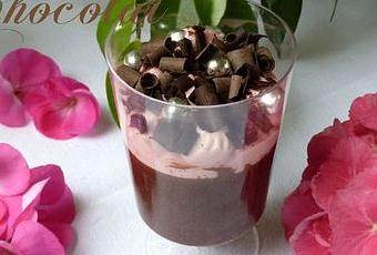 - J'ai décoré mes verrines avec de la crème chantilly que j'ai parfumé en y ajoutant un coulis de framboise et du sucre glace. J'en ai recouvert quelques unes avec des copeaux de chocolat que j'ai fait en utilisant un éplucheur après avoir légèrement réchauffer une tablette de chocolat en la passant 30 secondes au micro-onde à température minimale.
