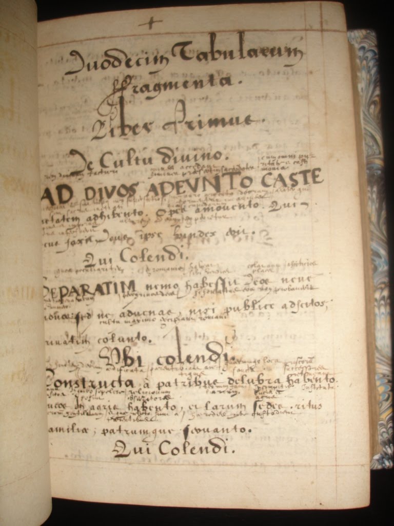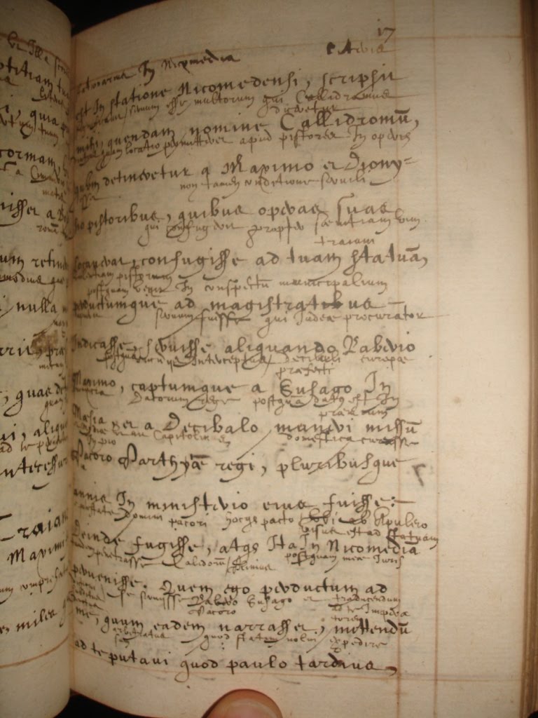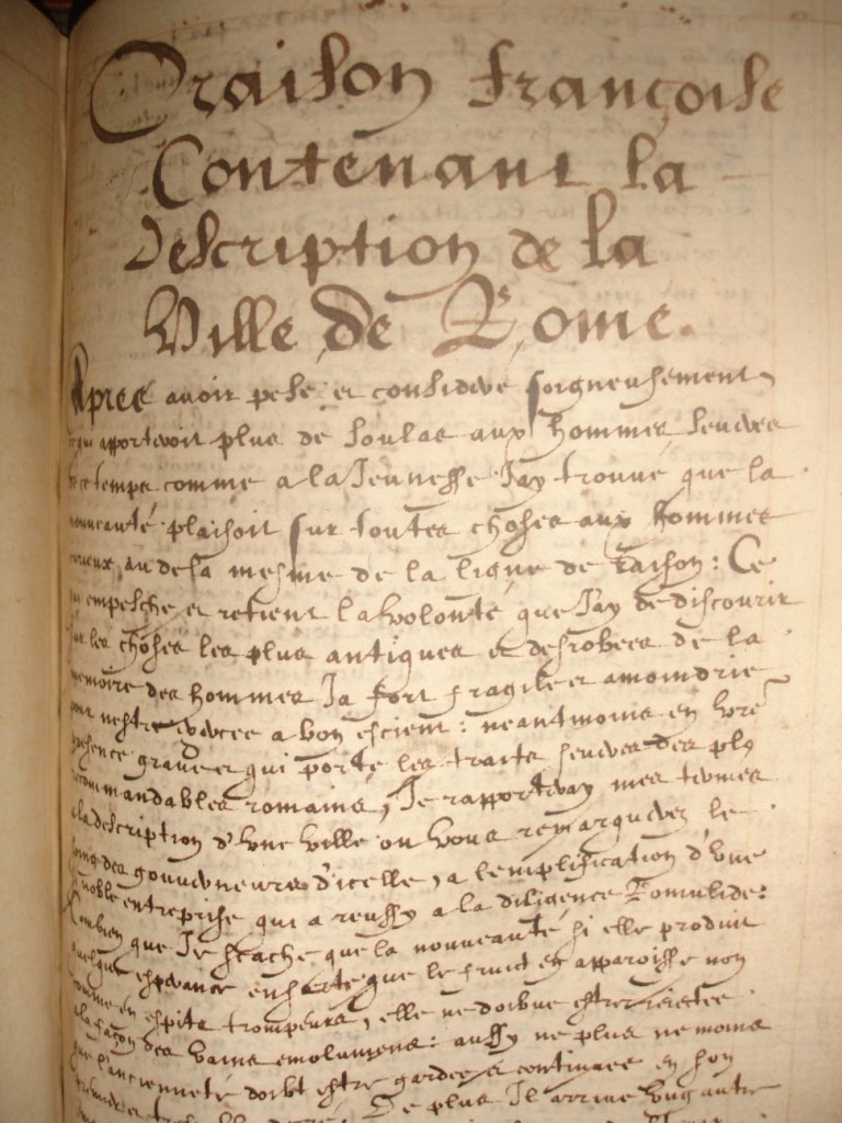 1. Olivier vient d'acquérir un ouvrage. C'est un petit volume manuscrit dont le dos a été rafait et qui semble antérieur au 17ème siècle. Il est entièrement réglé, toutes tranches dorées. C'est un recueil de textes divers en latin majoritairement, mais aussi en grec et en français. Olivier a sa petite idée avec son "latin de cuisine", mais il continue de me poser trois questions toutes simples : 1) c'est quoi; 2) c'est de quand; 3) c'est à/de (la main de) qui?