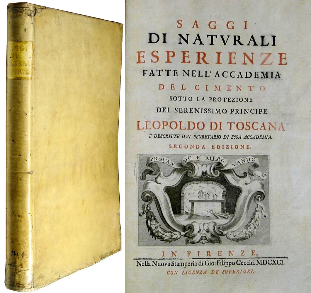 Elle est fondée à Florence en 1657 (cinq ans avant la Royal Society de Londres et neuf ans avant l'Académie des Sciences de Paris) à l'initiative des principaux disciples de Galilée, Evangelista Torricelli et Vincenzo Viviani, et sous le patronage de Ferdinand II de Médicis et de son frère le prince Léopold. Leur but était de compléter les travaux de Galilée par des expériences mettant en évidence la supériorité des nouvelles théories.Cette société se devait d'observer les principes suivants :- L'expérimentation (examen des causes des phénomènes scientifiques) et la publication des résultats.- La réfutation des spéculations non fondées,- La création des instruments scientifiques de laboratoire,- Les définitions des unités de mesure,Les membres effectuent donc de nombreux expériences, principalement dans les domaines de la thermométrie, de la barométrie et de la pneumatique, à l'aide d'instruments de leur invention et de nouvelles méthodes de recherche.Les travaux de cette institution servirent de modèle aux laboratoires du XVIIIe siècle.Après une existence assez éphémère, les activités de l'Accademia s'arrêtèrent en 1667 sur la publication en 1666 par le secrétaire Lorenzo Magalotti des résultats des travaux, texte rédigé en langue vulgaire (italien) sous le titre "Saggi di Natvrali Esperienze fatte nell'Accademia del Cimento sotto la protezione del Serenissimo Principe Leopoldo di Toscana e descritte dal Segretario di essa Accademia". Une seconde édition paru en 1691. Des éditions en langue anglaise et en langue latine furent publiées jusqu'à la fin du XVIIIe siècle.C'est le compte-rendu des expériences menées par Torricelli et plusieurs autres savants, dans ce que nous appellerions aujourd'hui le premier laboratoire de recherche. On y trouve des chapitres sur la chaleur et le froid, l'humidité de l'air, la mesure du temps (pendule), la lumière et le son, l'aimant, l'électrostaticité de l'ambre et le plus important sur la compressibilité de l'air. Les textes sont accompagnés de nombreuses planches gravées par Modiana, en autres, le tube barométrique de Torricelli, illustration que l'on trouve encore de nos jours dans les traités de physique élémentaire.Cet ouvrage, dans sa seconde édition de 1691, est un volume in-folio relié plein vélin d'époque, comportant 1 f.bl., faux titre, titre, portrait de Cosme III Grand Duc de Toscane, 6 ff. dédicace et avis au lecteur, 269 pp. de texte, 9 ff. de tables , 75 planches gravées, à pleine page, la plupart répétées, bandeaux, lettrines et culs-de-lampe.Rappelons les noms des principaux savants de l'époque que nous venons d'évoquer :Copernic (1473 - 1543) - Tycho-Brahé (1546 - 1601) - Galilée (1564 - 1642) -Kepler (1571 - 1630) - Descartes (1596 - 1650) - Pascal (1623 - 1662) - Newton (1643 - 1727)H