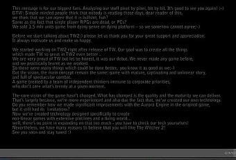 "Ce message est pour nos plus grands fans, ceux qui analysent ce que l'on diffuse pixel par pixel, petit à petit. C'est bon de vous voir à nouveau ! En passant : les gens simples pensent que, de nos jours, plus personne ne lit rien. Cher lecteur, je pense que nous serons d'accord pour dire que c'est de la connerie, non ? De même que le fait que les RPG solo sont morts, ou le PC ? Nous avons vendu plus d'1.5 millions de copies d'un jeu d'un genre mourant sur une plateforme mourante, et nous ne pouvons donc pas être d'accord.