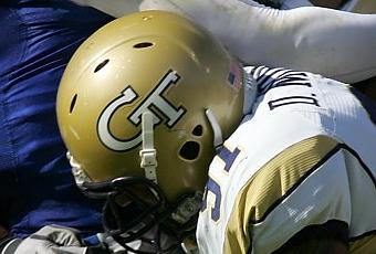 Ci-dessus : Thaddeus Lewis (QB) de l'université de Duke subit la charge de Derrick Morgan (DE), au profit de Georgia Tech.--------Prospect #2 : Derrick Morgan (DE).- Height : 6'3.- Weight : 266 lbs.- College : Georgia Tech.- Conference : ACC.-------- Scout Combine (Top-Perform's).- 40 Yard-Dash : 4'72.- 3 Cones Drill : 7'12.- Broad Jump : 9'04. --------Derrick Morgan (DE) est un joueur performant, dont la taille et la vitesse en font un parfait candidat aux formations 4-3. Les analystes lui attribuent de nombreux points forts, parmi lesquels ; une excellente maîtrise des techniques liées à son poste (Club, Rip, Spin...), une polyvalence certaine contre les jeux aériens et terrestres, ainsi qu'une parfaite maîtrise de ses mains. Il serait probablement le meilleur DE de la Draft 2010, si l'on tirait un trait sur les nombreux doutes qui planent à son sujet. Sera-t'il capable de se s'adapter à un schéma 3-4 en tant qu'OLB, malgré ses lacunes en terme d'agilité et de couverture de zone?