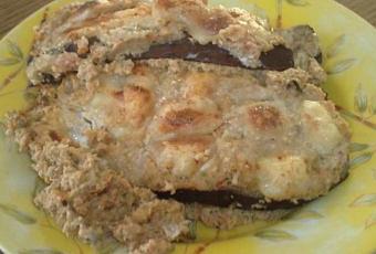Mettre 2 tranches d'aubergine grillées dans le fond d'un petit plat ŕ gratin, répartir les 2/3 de la préparation dessus, recouvrir des tranches restantes puis du reste de la garniture.
