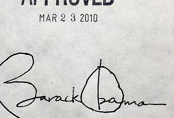 1 minute, 35 secondes et 22 stylos, ont été nécessaires à Barack Obama pour apposer sa signature sur la réforme de l’assurance maladie.Il s'agit d'une tradition, qui remonterait jusqu'à Franklin Roosevelt. L'utilisation d'une batterie de stylos permet d'offrir "un souvenir aux personnes qui ont joué un rôle significatif dans l'adoption d'une loi", rappelle Mark Peterson, professeur de politiques publiques et de sciences politiques à UCLA. Cela peut donner une signature un peu hachée, comme on peut voir ci-dessus, mais plus il y a de stylos plus on a de souvenirs à offrir à ses amis... :)