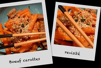 Ingrédients pour 2 personnes: 300g de rumsteck (ou faux-filet ou autre morceau de boeuf) - 400g de carottes - un gros oignon - une pincée de cannelle en poudre - une pincée de cumin en poudre - une CC de sésame doré - une CS d'huile d'olive - une CC de miel liquide - sel et poivre