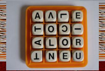 Vous connaissez le Boggle®. C’est un jeu de société. 16 dés dont chaque face affiche une lettre. Ces dés sont dans une boite. On l’agite et quand les dés sont retombés dans les cases, 16 faces, donc 16 lettres, sont apparentes. Il faut alors combiner ces lettres pour former des mots. Précisions extraites de la règle du jeu :