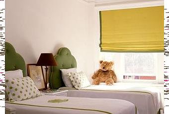 Des lits jumeaux avec une belle tête de lit verte et un joli store assorti, un coin bureau pour petite fille organisée et un coin "causette" avec lit banquette recouvert de coussins colorés et de magnifiques rideaux qui donnent tout son charme à la chambre !