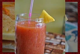 Passer au malaxeur le jus et les fruits congelés. La consistance doit être assez épaisse et veloutée.Un bon smoothie doit être de consistance assez épaisse pour qu'une paille insérée dans le verre tienne debout toute seule.