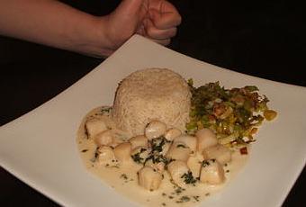 Servir les noix avec un ramequin de riz et les poireaux. Napper de sauce.