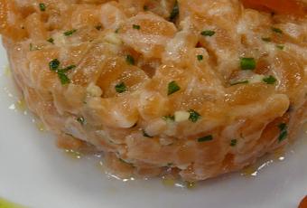 Saumon frais haché cru à la commande, assaisonné avec une sauce mayonnaise à l’huile d’olive et au jus de citron additionnée de ciboulette, d’échalotes ciselées, de câpres et de persil haché. Ici la mayonnaise est remplacée par une vinaigrette au gingembre. D’autres assaisonnements peuvent être intéressants comme l’huile de noix ou les zestes d’oranges … Laissez libre cours à votre imagination.