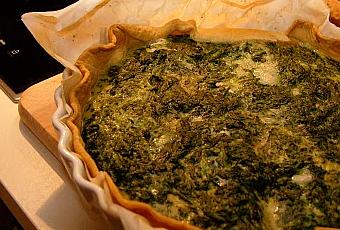 Installer la pâte dans un moule à tarte, y positionner, après l'avoir coupé en rondelles de 5mm, le fromage de chèvre, puis y verser le mélange œufs-épinards-crème-pincée de sel. Faire cuire 3/4 heure à 180°. Servir chaud ou froid avec une salade.