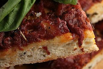 Parsemer la pâte de feuilles de basilic fraîches, recouvrir ensuite le basilic des tomates confites.