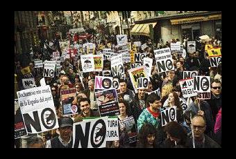 Les manifestants dimanche dans le centre de Madrid, parmi lesquels de nombreux jeunes, ont également protesté contre l'appui apporté à la tauromachie par le roi Juan Carlos, grand amateur de corridas.
