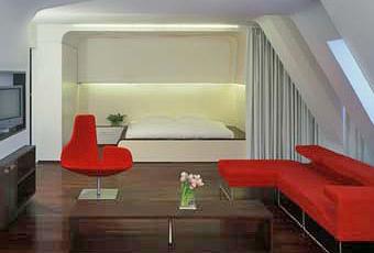 Le cabinet d’architecture Graft Architects a révolutionné les standards du design en créant des chambres qui paraissent sortir d’un film de science-fiction. Sur le thème du rouge et du blanc, les 77 chambres sont toutes en courbes, très féminines, et osent des aménagements fantasques et inattendus. Les 12 chambres qui disposent d’une baignoire sont organisées de telle sorte que le lit et la baignoire se trouvent au même niveau. Cette dernière a ainsi été enfoncée dans de la terre cuite et de l’ardoise intégrée ensuite dans des panneaux de bois rattachés au chevet du lit. Mystique !