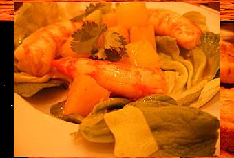 4) Dans chaque assiette, déposez un fond de feuilles de coeurs de laitue. Garnissez avec 4 gambas par personne et quelques cubes d'ananas. Arrosez de quelques cuillérées de sauce.