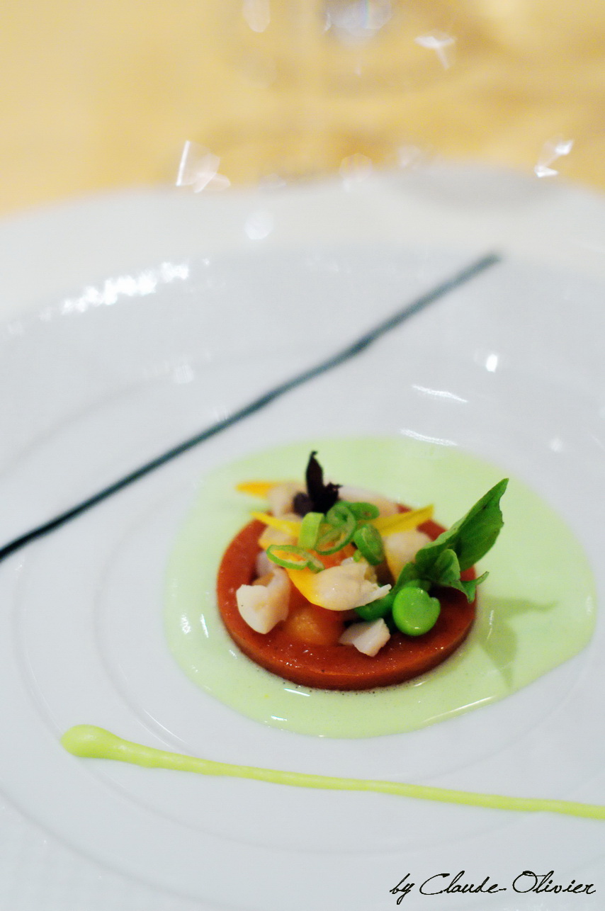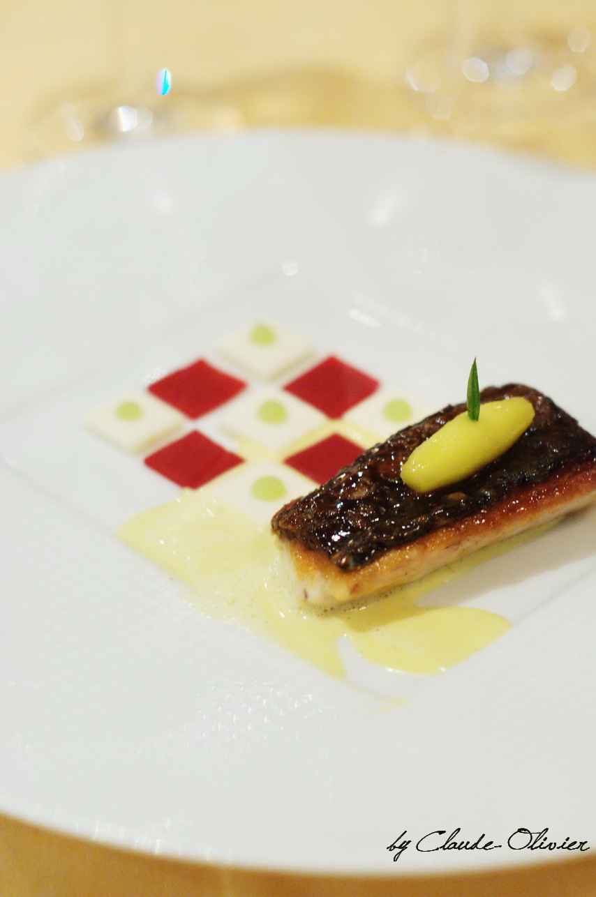 Niveau photo, pas de miracle..Impossible de faire beaucoup de photos dans une salle pleine d'un restaurant gastronomique. Mieux vaut être discret et assez rapide…c'est pour cela que parfois les images ne rendent pas vraiment le plat original…mais…on fait ce que l'on peut (détail technique: Nikon D300, iso 1250 et Nikkor 50mm f1.8 fermé à 2.8 pour avoir un peu moins de flou vu la distance très rapprochée avec les plats).