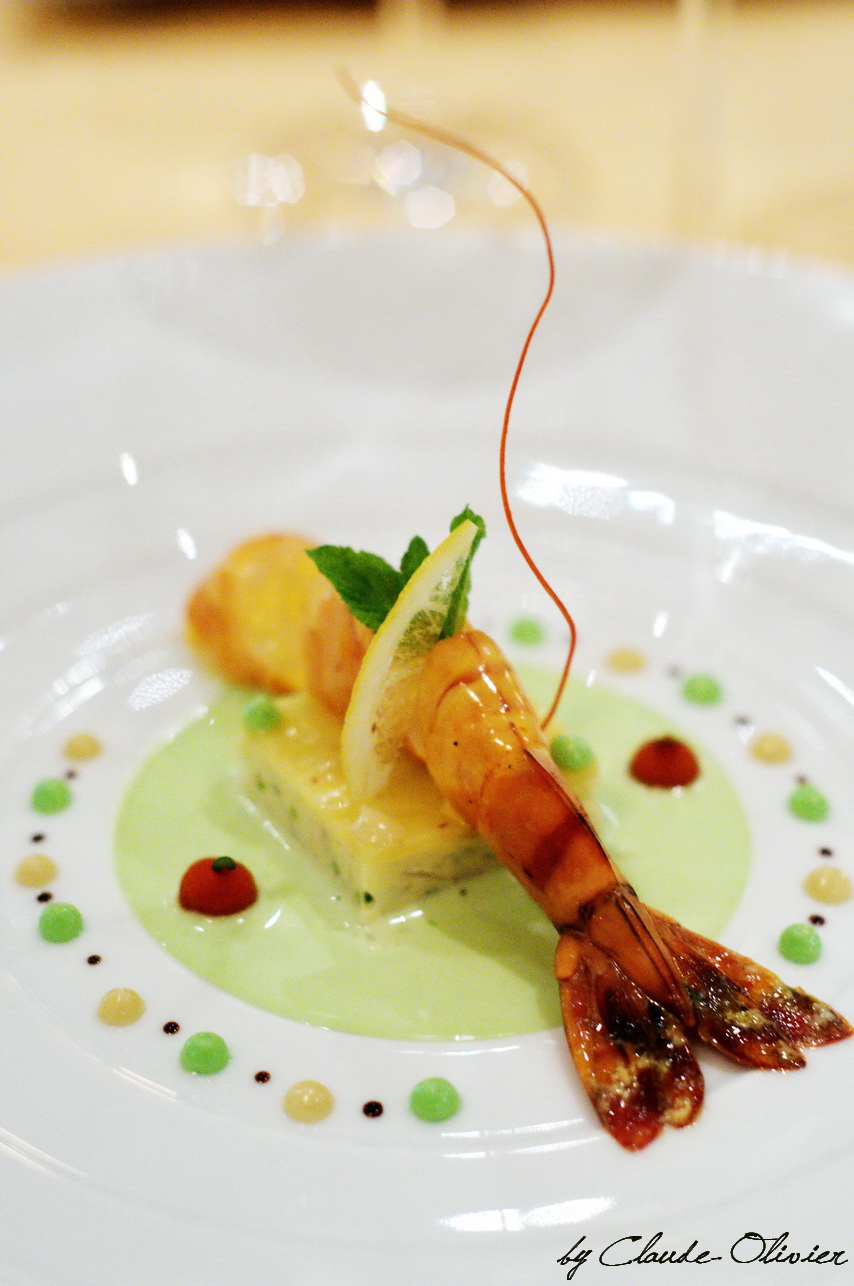 Nous continuons avec une barquette de chair de tourteau à la pulpe de citron bergamote, une grosse crevette marinée à l’huile de menthe verte, et une crème de sardines.