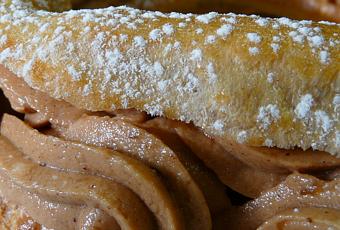 • Garnir l’intérieur de crème mousseline pralinée à l’aide d’une poche munie d’une grosse douille cannelée.