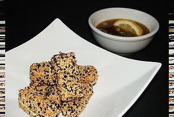 Zélée que je suis, j'ai fait cette recette en tant que plat principal hier soir. Or, on a beau aimer le goût des graines de sésame ainsi que la fraîcheur de ma petite sauce japonaise improvisée il n'en reste pas moins que c'est un goûter un peu sec pour être servi en plat principal. Je vous les suggère donc en canapés pour vos soirées "Vé-jet-set-tariennes" puisqu'ils sont faciles à manipuler, rassasiants, abordables et mignons comme tout. Pour une texture réussie, couper vos morceaux assez épais et cuire tout au plus 8 minutes.
